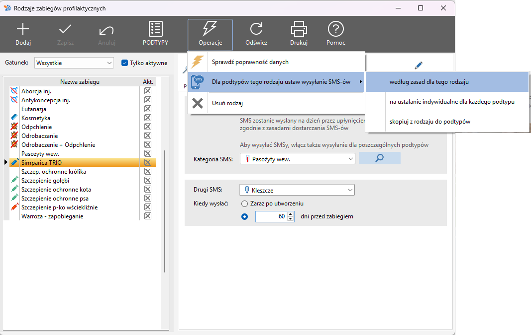 W ramach jednego rodzaju profilaktyki możemy mieć preparaty, dla których zaplanujemy 2 wiadomości SMS, oraz takie, dla których wystarczy 1 wiadomość. W takim przypadku konfigurację SMS-ów przeprowadzamy następująco: