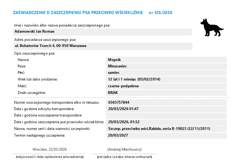 • Zaświadczenie o zaszczepieniu psa przeciwko wściekliźnie,