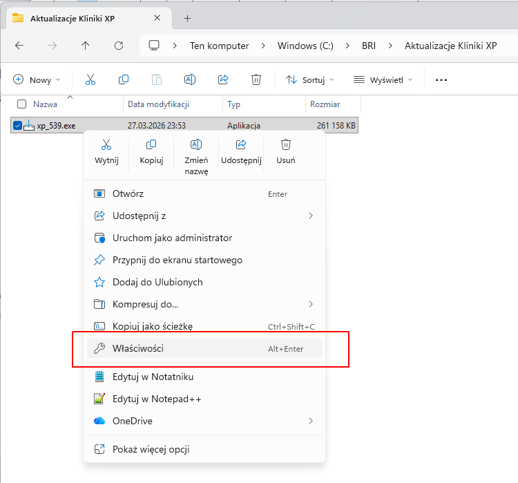 Podpis cyfrowy możemy również sprawdzić bez uruchamiania pliku, klikając na nim prawym przyciskiem myszy i wybierając opcję Właściwości: