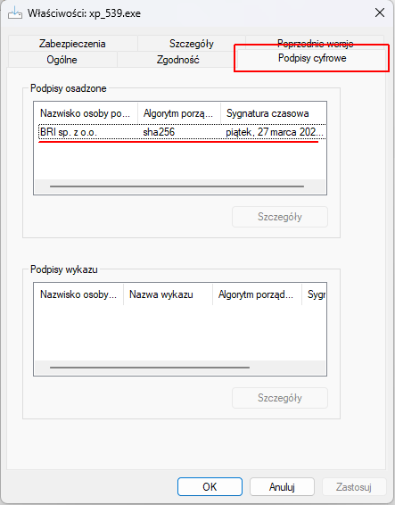 Jeśli plik nie jest podpisany, we właściwościach nie będzie zakładki Podpisy cyfrowe.