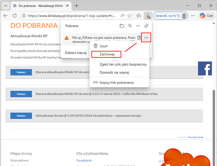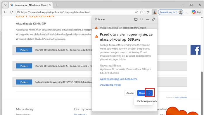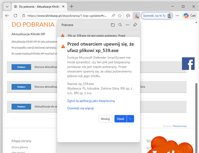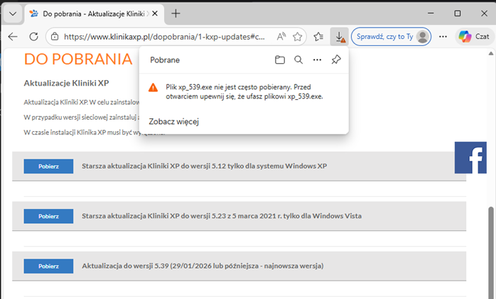 Obecna wersja Kliniki XP wykorzystuje najnowsze biblioteki dostawców z całego świata, które zaledwie kilka dni temu zostały udostępnione do dystrybucji i prawdopodobnie nie są jeszcze rozpoznawane jako zaufane przez zapory i systemy antywirusowe. Dodatkowo w ostatnim czasie niemal każdego dnia pojawiały się nowe pliki z aktualizacją uwzględniające kolejne wymogi KSeF i ustawy o ochronie zwierząt. Z tego powodu podczas próby pobrania lub instalacji nowych wersji Kliniki XP mogą pojawić się różne ostrzeżenia lub blokady.